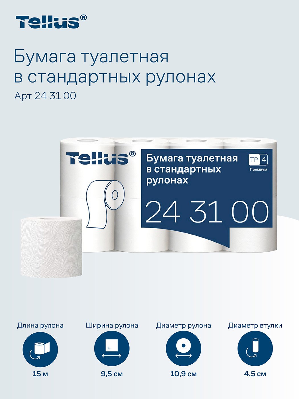 Tellus - Новое имя бренда Торк Туалетная бумага Торк-Tellus Премиум - белоснежная, ультрамягкая и прочная. Обладает высокой впитываемостью и подходит для всех типов туалетных комнат. Благодаря новому тиснению удалось повысить потребительские качества продукта, что сделало его еще более привлекательным.