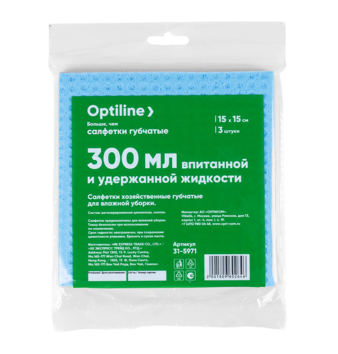 Салфетка губчатая Optiline 15х15 см, 3 штуки в упаковке