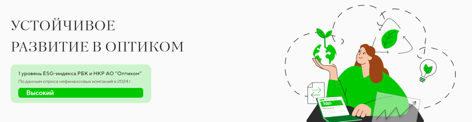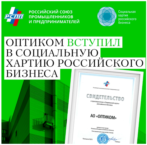 Социальная хартия российского бизнеса, инициированная Российским союзом промышленников и предпринимателей (РСПП), является национальной платформой для формирования корпоративной стратегии в области устойчивого развития (ESG). Хартия была принята в 2004 году, а ее последняя редакция — в 2021 году. Хартия объединяет принципы ответственного ведения бизнеса, эффективного управления ESG-факторами и рисками, а также конструктивного взаимодействия с заинтересованными сторонами. Документ соответствует ключевым международным стандартам, включая принципы Глобального Договора ООН. На сегодняшний день к Хартии присоединились 319 организаций, в которых суммарно работают более 11 миллионов человек. Деятельность «ОПТИКОМ» в области устойчивого развития строится на внедрении принципов циклической экономики в работу компаний, исследовании доступных экорешений, обучении осуществлять ответственные и экономически выгодные закупки и использовать ресурсы природы максимально эффективно. Устойчивое развитие — один из стратегических принципов компании «ОПТИКОМ», направленный на сохранение равновесия между экономическим ростом, социальной ответственностью и экологизацией бизнеса.